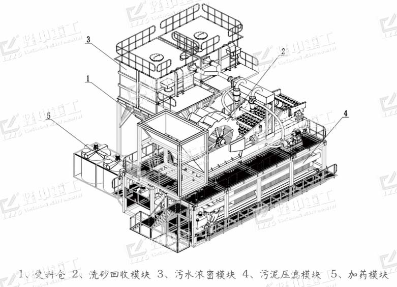 3、一體化設(shè)計:集成洗砂、回收、脫水、濃密、壓濾等功能于一體,組合架體設(shè)計,模塊化組裝,機型更改空間自由度較高,拆裝靈活性更大。